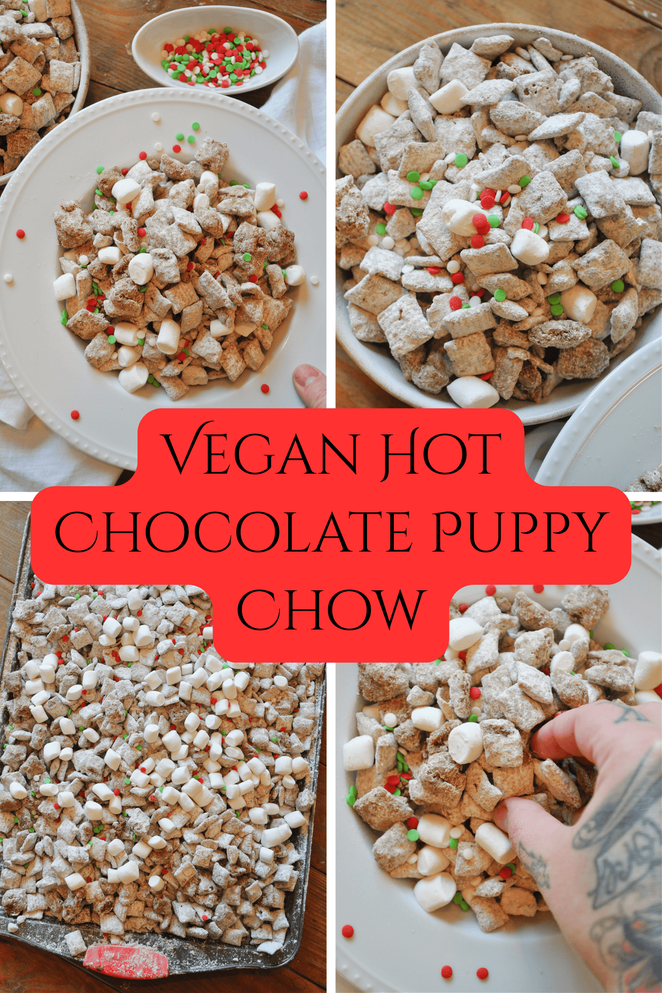 Easy & fast vegan puppy chow (or muddy buddies) packed with all the cozy holiday hot-chocolate vibes! This festive twist on a classic Christmas treat is completely dairy-free and totally irresistible.