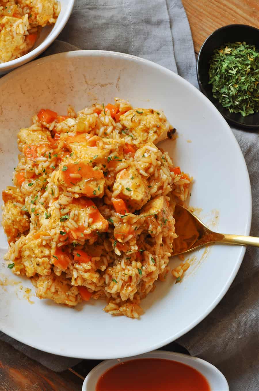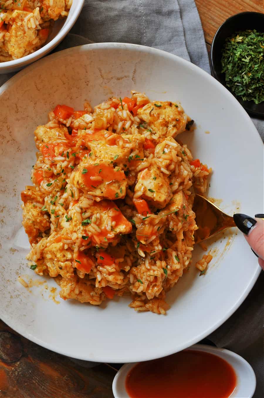 This buffalo ranch vegan “chicken” and rice is perfection. However, if you don’t love spice or you want to make this for kids, it is honestly so good even with out the hot sauce. You can use this as a base and have a lemon herb dish by adding lemon juice instead of hot sauce. Or add vegan yogurt and have a creamy herb “chicken” and rice! However you want to season this hearty dish up, I think you’ll love it!