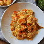 Hi, I’m Lauren and I love a great many things. But none more than buffalo sauce. I crave it, dream about it, need it! So, this buffalo ranch vegan “chicken” and rice is so yummy, spicy, vinegary. All I’m saying is this super easy meal satisfies all those buffalo cravings. PLUS, I added ranch spices directly into the rice to give it a nice flavor. Also, the replacement for the chicken in this recipe is tofu, tossed in a ranch spice mix and roasted. Then the tofu is stirred into the rice when the rice is close to being done.