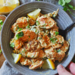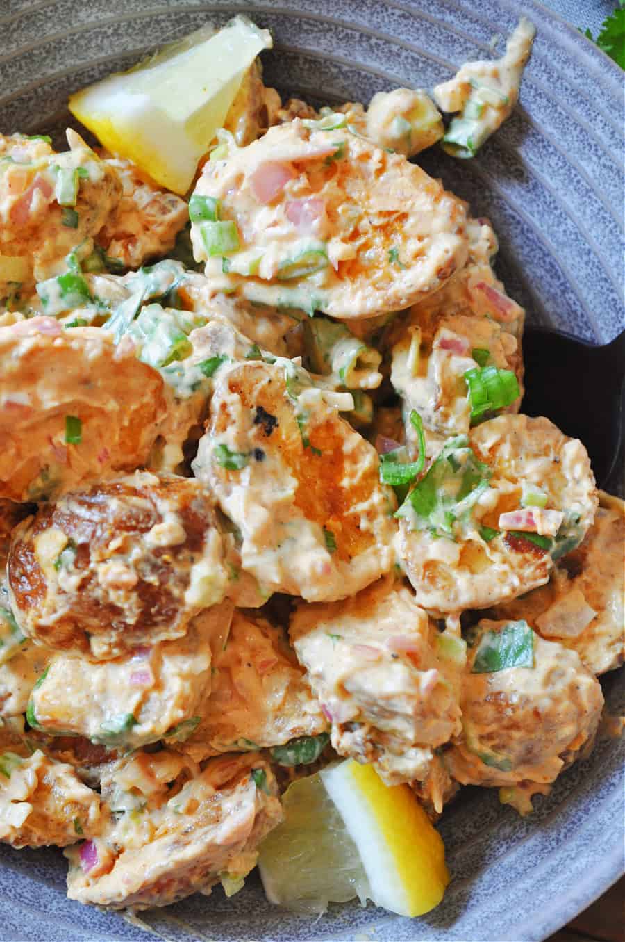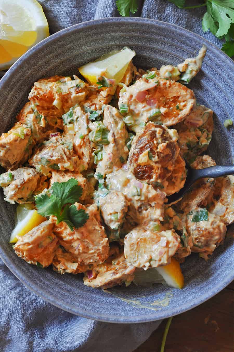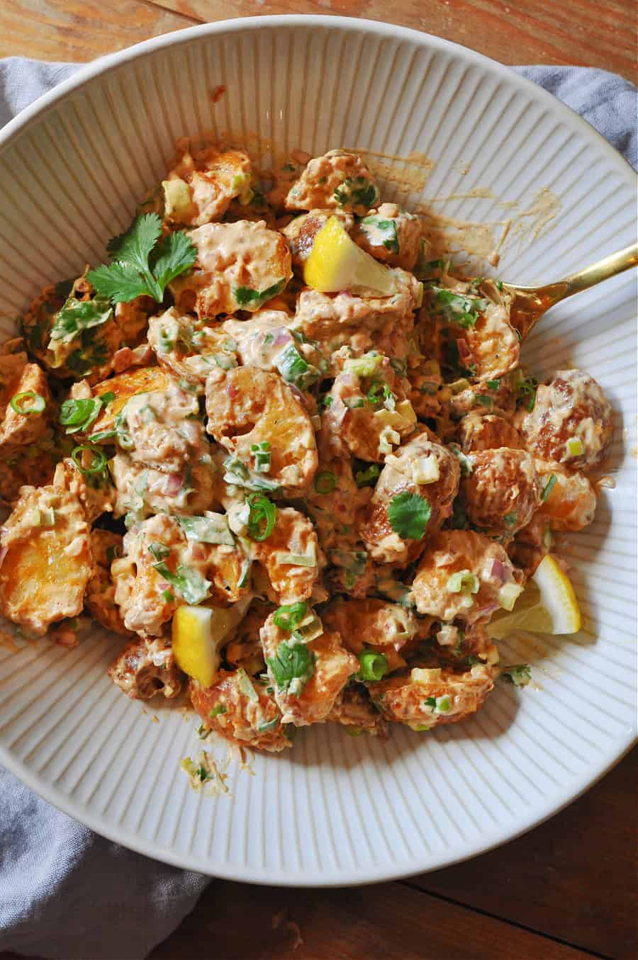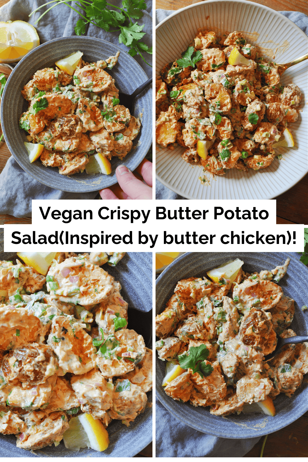 I made a vegan potato salad inspired by one of my favorite dishes of all time, Butter Chicken. Making this the greatest vegan potato salad ever! Before I went vegetarian and then vegan, butter chicken was my go to at any Indian restaurant. This crispy butter potato salad is super simple, really flavorful and the sauce tastes just like a butter chicken sauce. But the only cooking required is to boil and then air fry or bake the potatoes. The sauce is just whisked together in a bowl and then the crispy potatoes are tossed in the sauce. Topped with fresh cilantro and scallions!