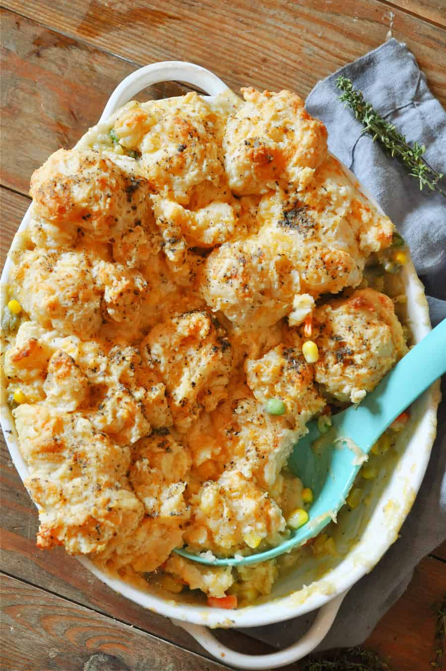 - Make a batch of vegan cheddar bay biscuits according to the recipe(link below) and then scoop about 2 tablespoon sized dollops all over the top of the filling.