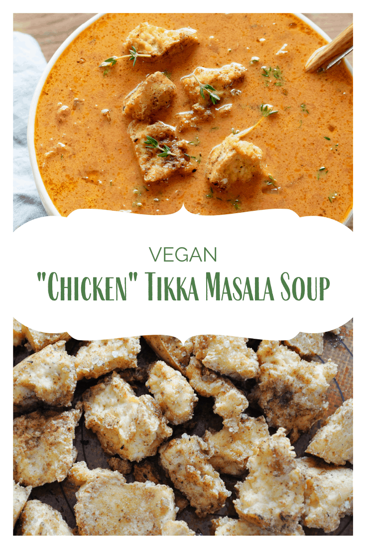 I have been obsessed with Indian food and classic Indian spices since I was a kid. Chicken tikka masala was always one of my favorites! So this Indian-inspired vegan “chicken” tikka masala soup is my new favorite soup. I know this is only Indian-inspired, but it comes from a place of absolute admiration and awe of all Indian flavors! It is so simple, but so comforting. You may want seconds. Sautéed onion and garlic, mixed with a blend of amazing spices. Mixed with veggie broth, crushed tomatoes and coconut milk. The “chicken” portion of this soup is super firm, baked until crispy spiced tofu. Frozen, then thawed and broken into pieces, the tofu takes on the perfect texture and holds up really well in this soup!