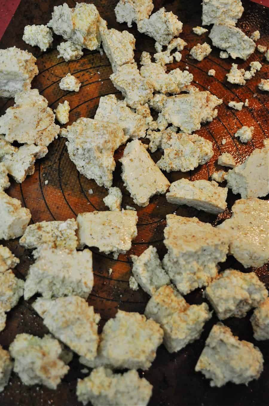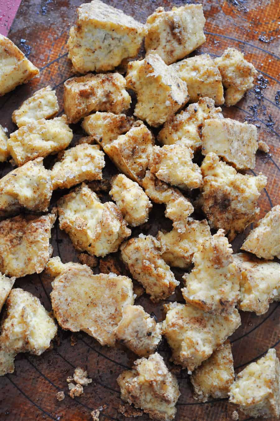 - Spread the tofu onto a sheet pan lined with parchment paper or a silicone mat. Bake for 15 minutes, toss then bake for 15-20 more minutes or until the tofu is firm and golden brown.