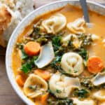 Ahh, yes. November has arrived. My favorite month for all the cozy soups. This vegan creamy tortellini vegetable soup is the coziest, most delicious and easiest soup! A few weeks ago, I posted a recipe for homemade vegan tortellini, and I wanted to show you another way to use it. You can also use store bought vegan tortellini, I recommend the Kite Hill brand. This simple hearty soup features, kale and carrots, but you can use any veggies you want.