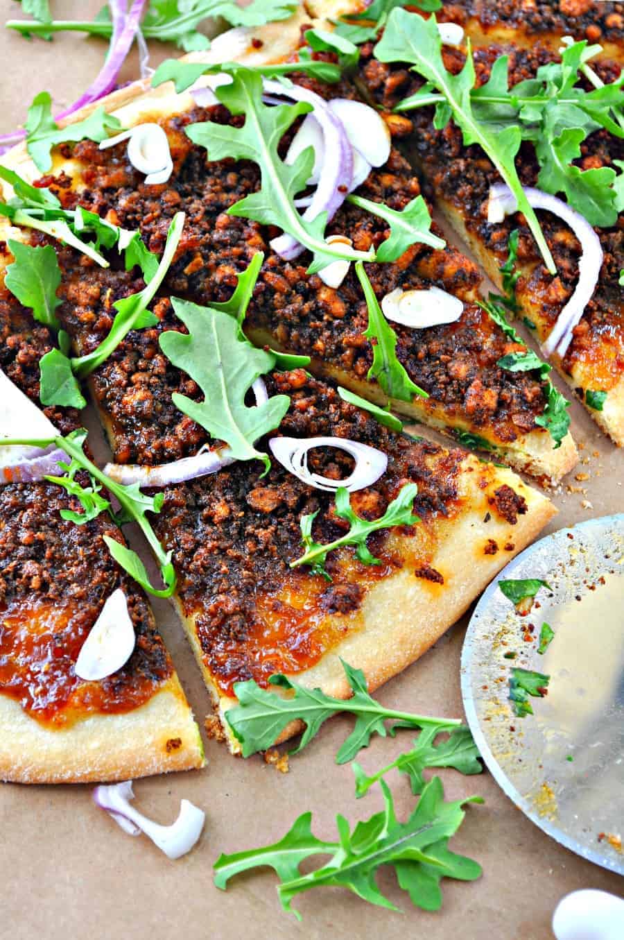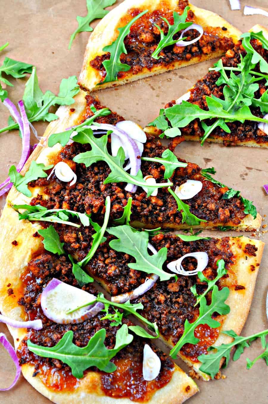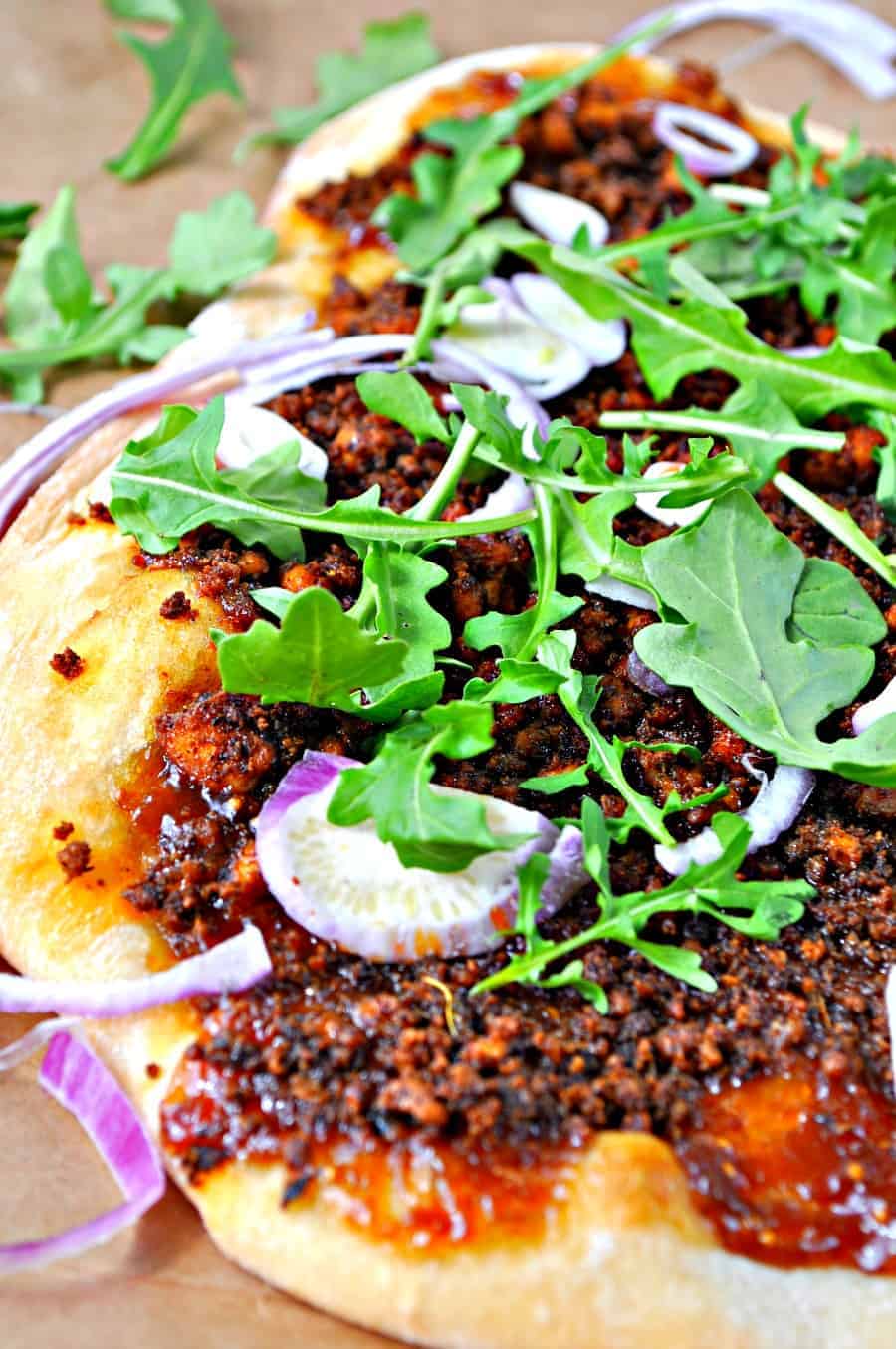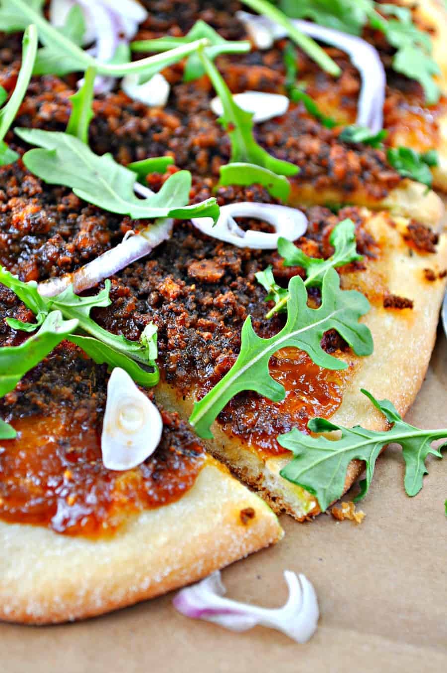 Top this pizza with fresh arugula and red onion to create a very well rounded flavor profile with the peppery freshness of the raw veggies. I think this is undoubtedly one of the most delicious pizzas I have ever had. You will not even miss the cheese, I promise.