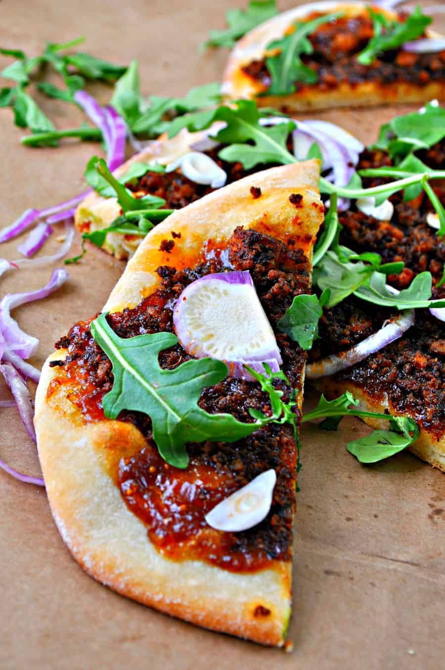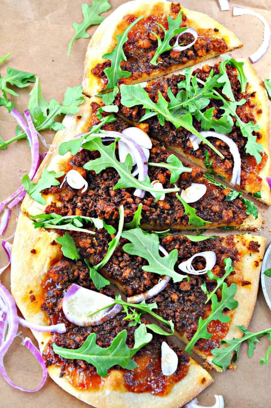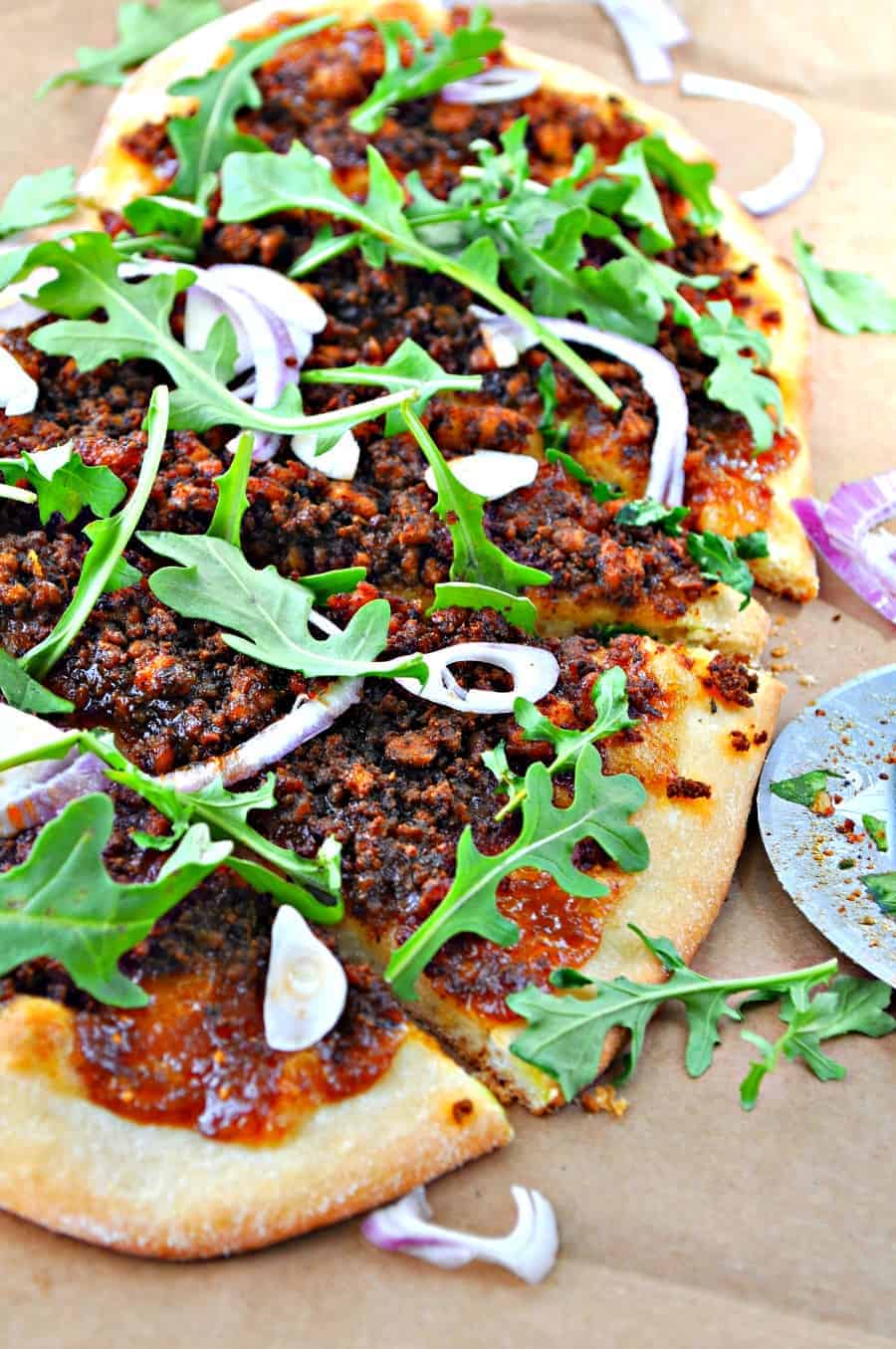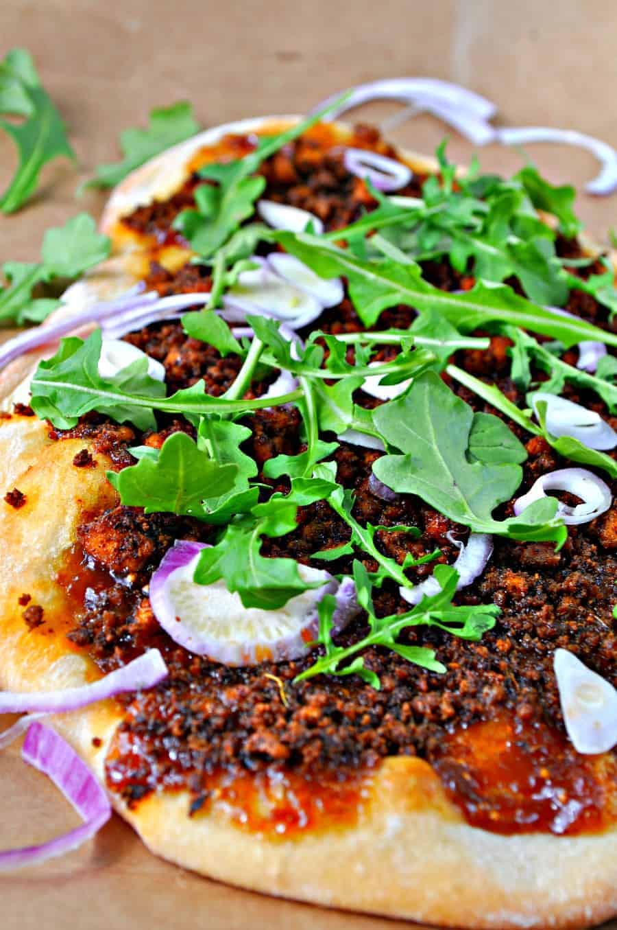 Top this pizza with fresh arugula and red onion to create a very well rounded flavor profile with the peppery freshness of the raw veggies. I think this is undoubtedly one of the most delicious pizzas I have ever had. You will not even miss the cheese, I promise.