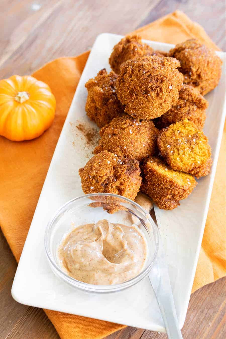 I am absolutely making these vegan pumpkin hush puppies as a quick appetizer for Thanksgiving! They are such a crowd pleaser, and perfect to put on the table for people to snack on while the rest of the meal is prepared. Honestly, serving them along side of everything else as a little bread component is also the best idea ever.