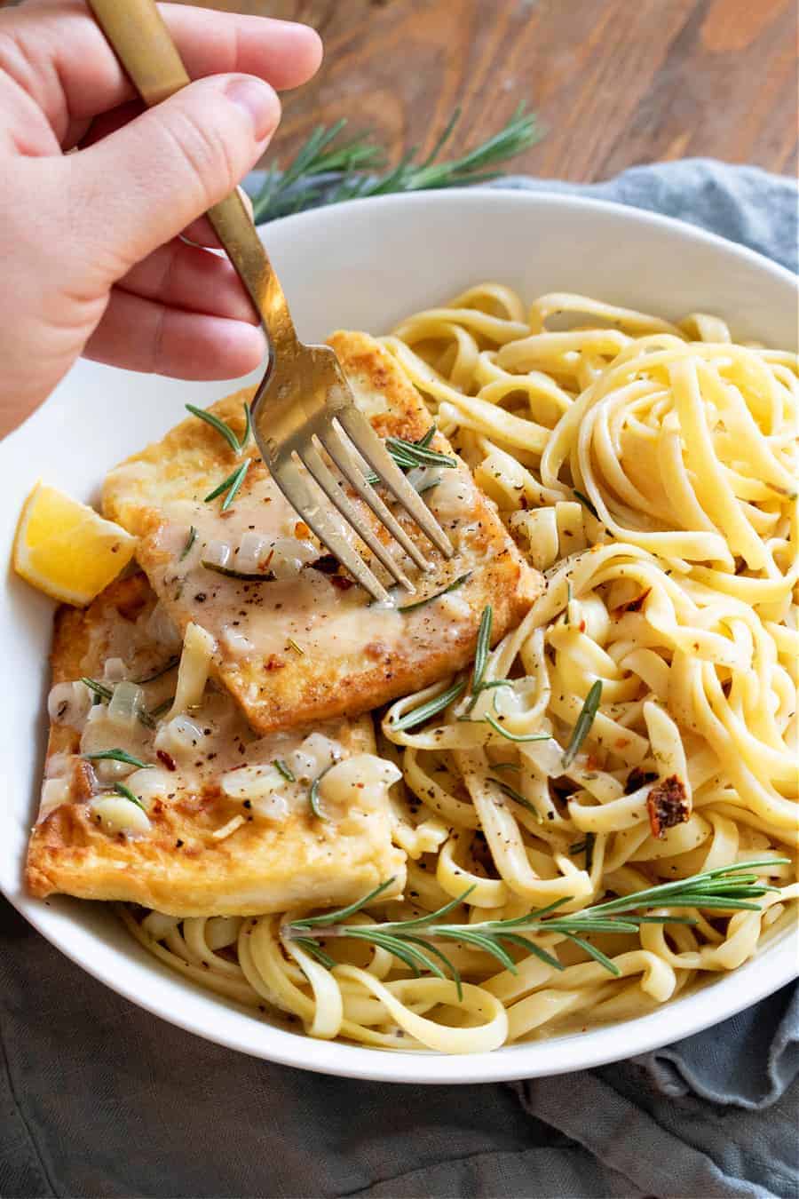 I made you guys this vegan tofu scallopini with garlic rosemary cream sauce, because I love you. You’ll probably love me too after you eat this. It’s really easy. Simple seasoned tofu dredged in flour and browned in olive oil until nice and crispy. Served with a very, very delicious cream sauce flavored with fresh garlic and fresh rosemary. I highly recommend serving with some pasta. This sauce recipe makes enough to toss the the pasta in it with extra for drizzling over the tofu! This is a great recipe to start off with if you haven’t cooked a lot of tofu, it is hard to mess up and really yummy!